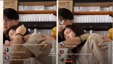Lolly tampak menangis sambil memeluk sang kekasih. Sesekali ia menghapus air matanya dengan tisu.