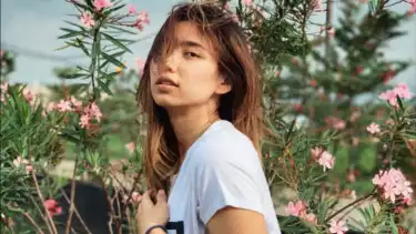 Yolla Yuliana berpose di depan bunga-bunga