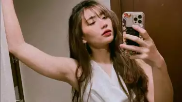 Momen Yolla Yuliana saat berswafoto didepan cermin dengan dress serba putih