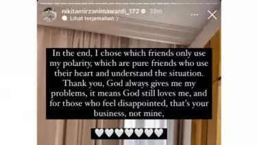 “Pada akhirnya, saya memilih teman mana yang hanya menggunakan popularitas saya, yaitu teman murni yang menggunakan hati dan mengerti keadaan. Terima kasih, Tuhan selalu memberiku masalah, itu berarti tuhan masih mencintaiku, dan bagi yang merasa kecewa, itu urusanmu, bukan urusanku,” tulis Nikita Mirzani dalam Instagram Story dengan menggunakan Bahasa Inggris.