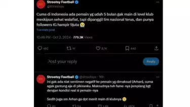 "Cuma di Indonesia ada pemain yang sudah 5 bulan gak main di level klub meskipun sehat walafiat, tapi dipanggil tim nasional terus dan punya followers IG hampir 9 juta," tulis @strootsys di akun official X nya pada Selasa (2/10/2024).