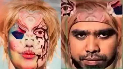 Tampangnya mirip perempuan, dengan bibir bergincu, dan rambut pirang yang agak panjang, namun sebagian wajahnya penuh dengan coretan.