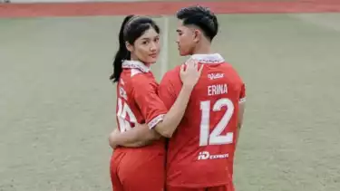 Erina Gudono terlihat mengenakan jersey merah dengan tulisan Kaesang dan nomor punggung 10, sedangkan Kaesang terlihat mengenakan jersey tulisan Erina dengan nomor punggung 12.