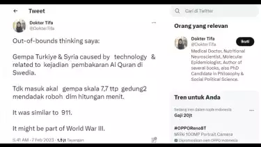 Melalui postingannya di Twitter, Dokter Tifa menduga bahwa gempa Turki disebabkan karena teknologi dan terkait dengan kejadian pembakaran Al Quran di Swedia.