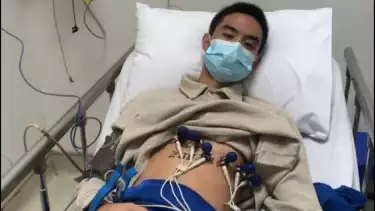 Dengan kabel-kabel alat medis yang dipasang pada badannya, Devano mencoba melihat kamera meski terbaring lemah diatas tempat tidur rumah sakit.