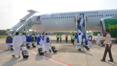 Ilustrasi jemaah haji Indonesia sebelum menaiki pesawat di bandara. (Tim tvOne/Agus Saptono)