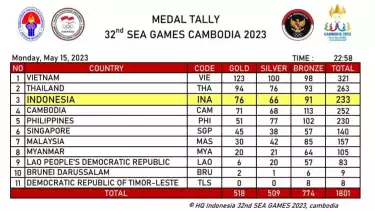 Kontingen Indonesia pun masih tertahan di posisi ketiga klasemen sementara perolehan medali SEA Games 2023 Kamboja terhitung Selasa (16/5/2023) pukul 4.00 WIB.