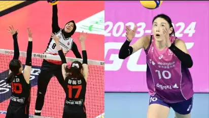 Ekspresi wajah dari ratu voli Korea menjadi sorotan penggemar V-League usai terlihat emosi karena serangannya berhasil dimentahkan oleh Megawati Hangestri cs.