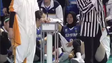 Kemudian, Park Jeong-ah yang berdiri itu tampak duduk di lantai sebelah Megawati yang sedang duduk di kursi pemain, kim Suji pun ikut duduk di lantai.
