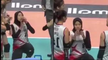 Megawati Hangestri saat time out, minum dengan cara duduk seperti adab Islam.